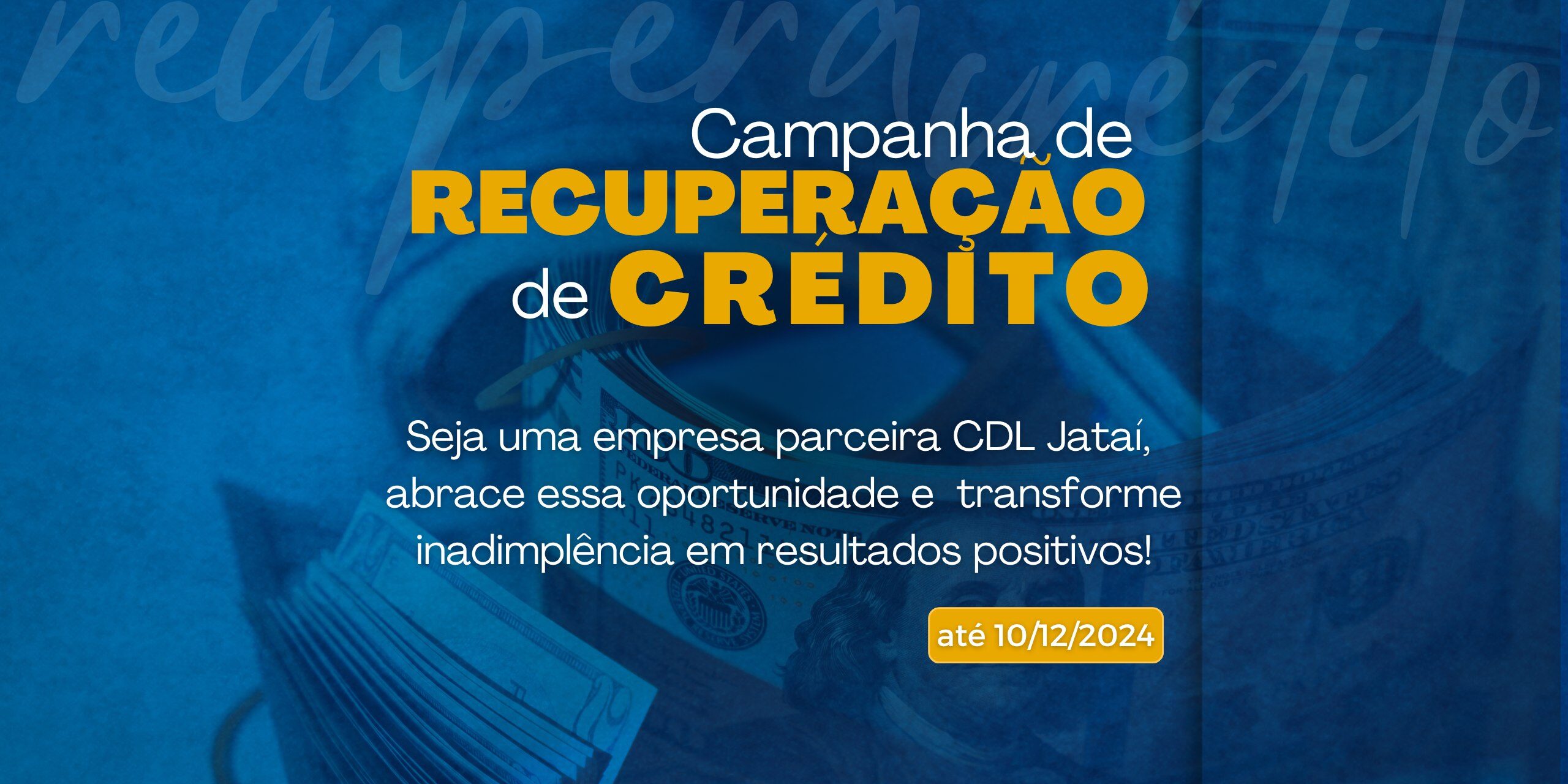 A CAMPANHA DE RECUPERAÇÃO DE CRÉDITO é uma ação fomentada pela CDL Jataí, visando a união do comércio local em ofertar descontos e renegociação de dívidas de forma atraente e se estende até 10 DE DEZEMBRO DE 2024.